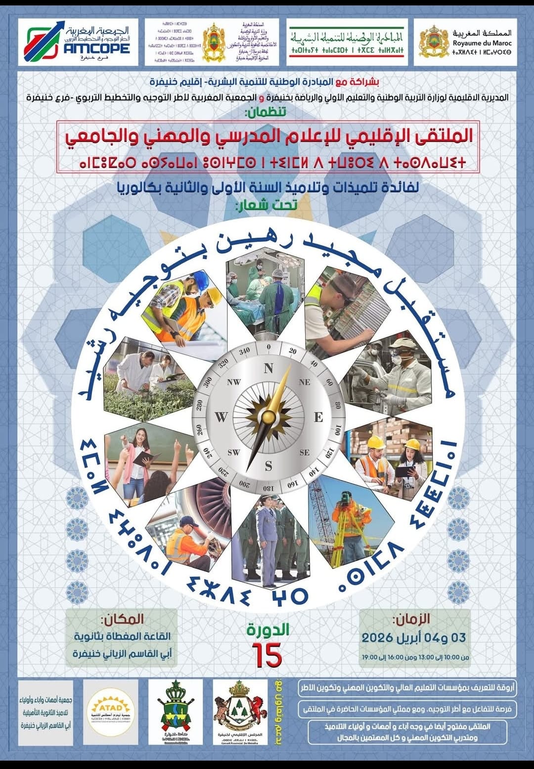 بدعم من المبادرة الوطنية للتنمية البشرية، تستعد المديرية الإقليمية لوزارة التربية الوطنية والتعليم الأولي والرياضة بخنيفرة، بشراكة مع الجمعية المغربية لأطر التوجيه والتخطيط التربوي – فرع خنيفرة، لتنظيم الدورة الخامسة عشرة للملتقى الإقليمي للإعلام المدرسي والمهني والجامعي، تحت شعار: “مستقبل مجيد رهين بتوجيه رشيد”، وذلك في إطار مواكبة التلاميذ في اختيار مساراتهم الدراسية والمهنية على أسس واعية ومدروسة.